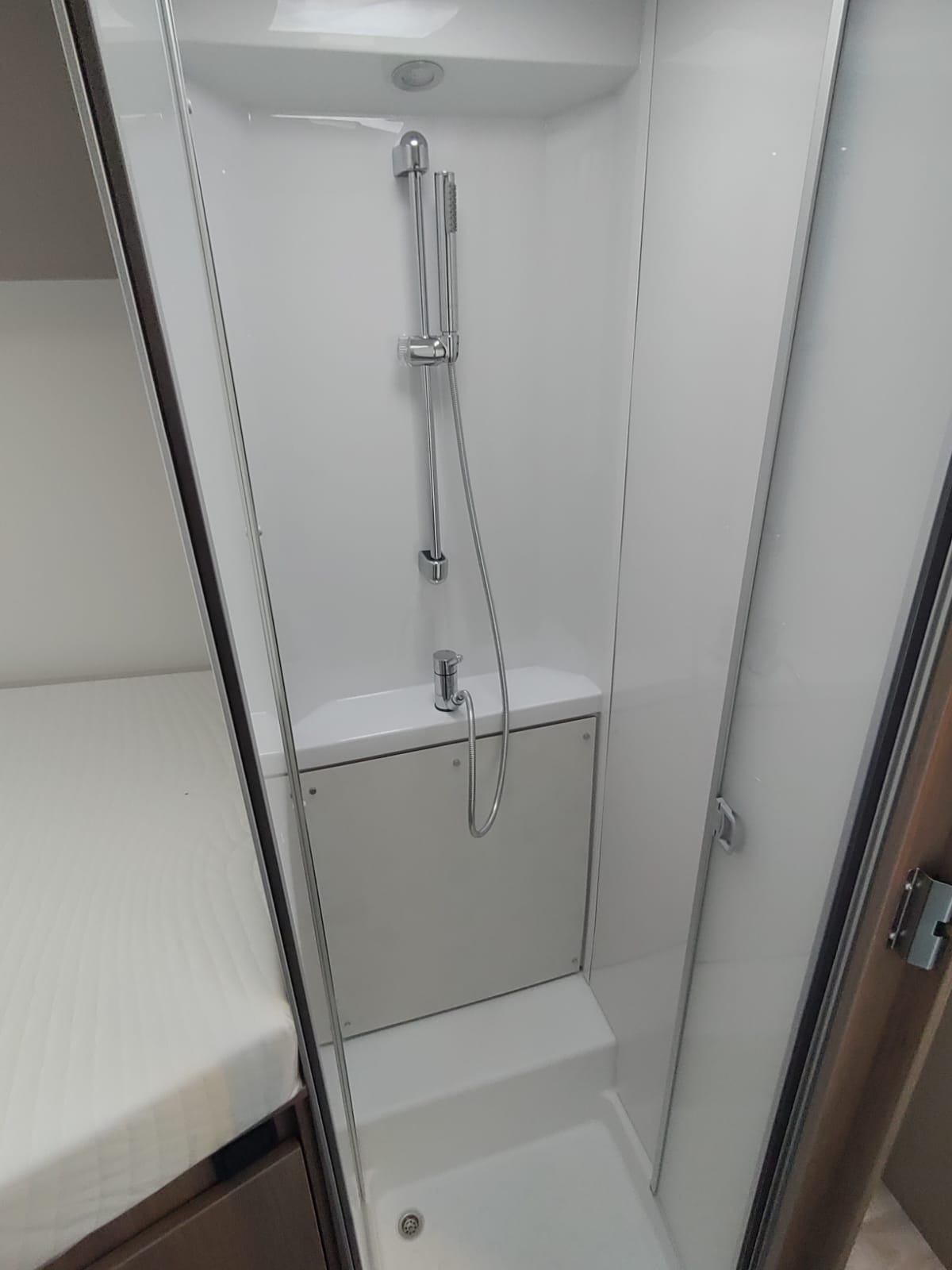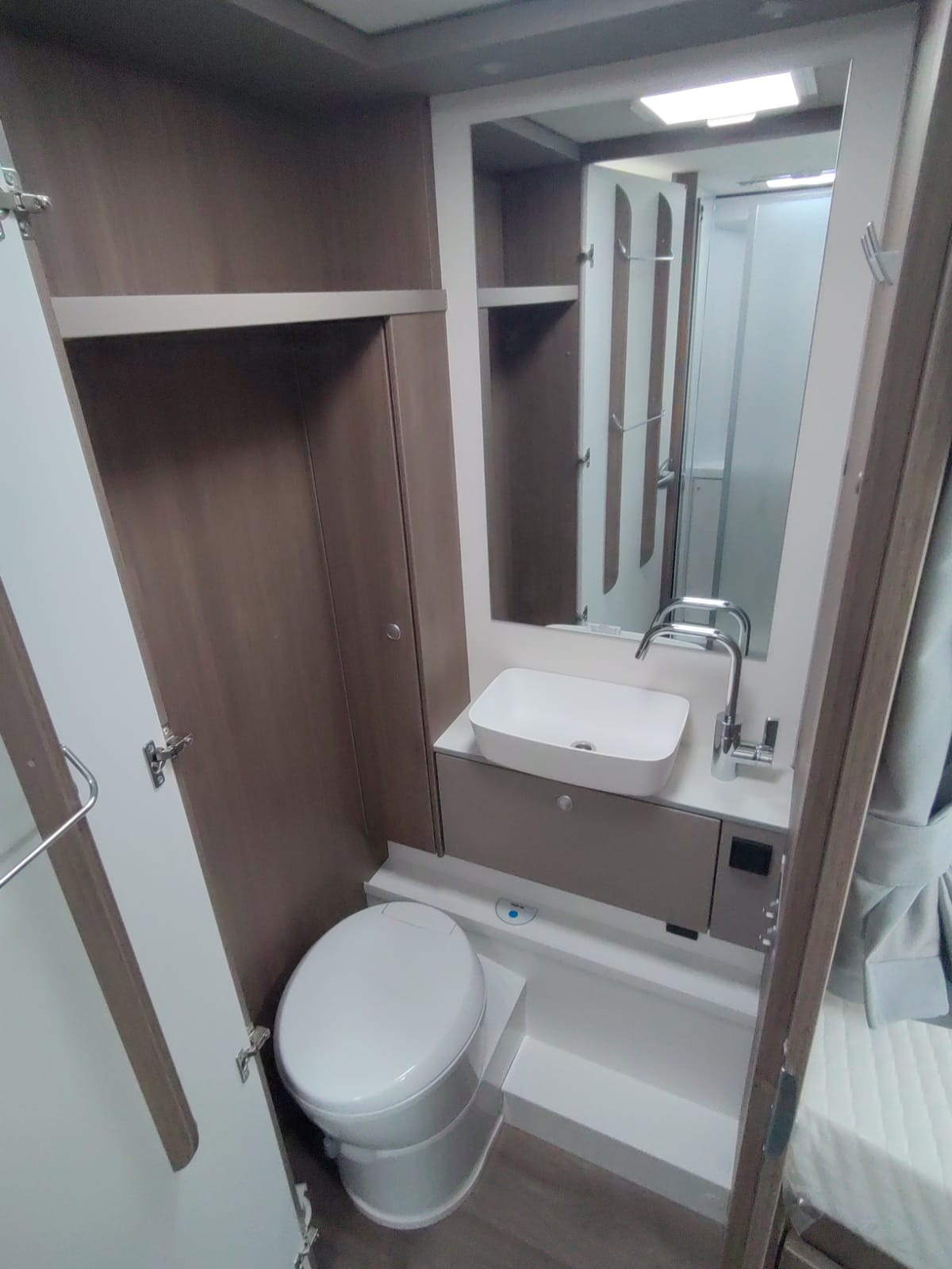 Dank der praktischen Trenntür zum Wohnzimmer ist das Badezimmer nicht nur als Badezimmer, sondern auch als Ankleidezimmer konzipiert. Mit der großzügigen Gestaltung des separaten Toiletten- und Duschbereichs und den zahlreichen Aufbewahrungsmöglichkeiten bietet das Badezimmer eine geräumige und funktionelle Umgebung.