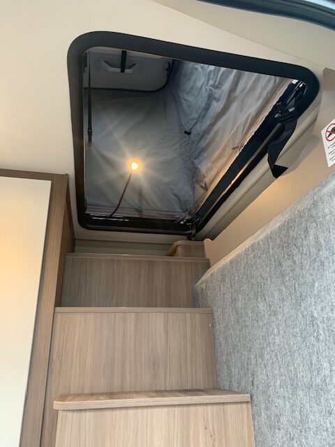 • Une marche fixe / escalier intérieur mène au toit relevable, avec des rangements intégrés — un détail atypique pour ce segment.
